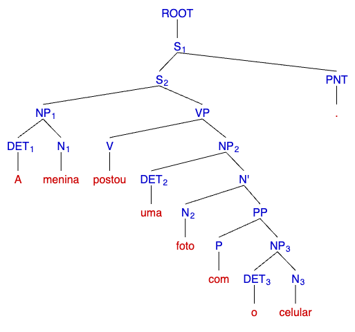 [ROOT [S [S [NP [DET A] [N menina]] [VP [V postou] [NP [DET uma] [N foto]]]] [PNT .]]]