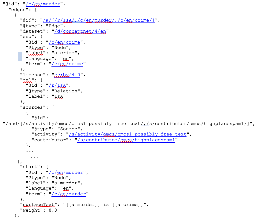 O framework computacional da ConceptNet contém uma hierarquia de URIs que identificam os principais componentes dessa base de conhecimento: afirmações (ou edges), termos (palavras ou frases em uma linguagem particular), relações (por exemplo, IsA), datasets, fontes de dados. Também possui uma API REST32 pela qual você pode obter os componentes no formato JSON. Cada edge, termo, relação, dataset e fonte da ConceptNet possui uma URI que os identificam e sua definição completa em JSON pode ser acessada via API. A Figura 9.6 apresenta um recorte da definição do termo “murder”, contendo a lista de edges a partir desse termo.