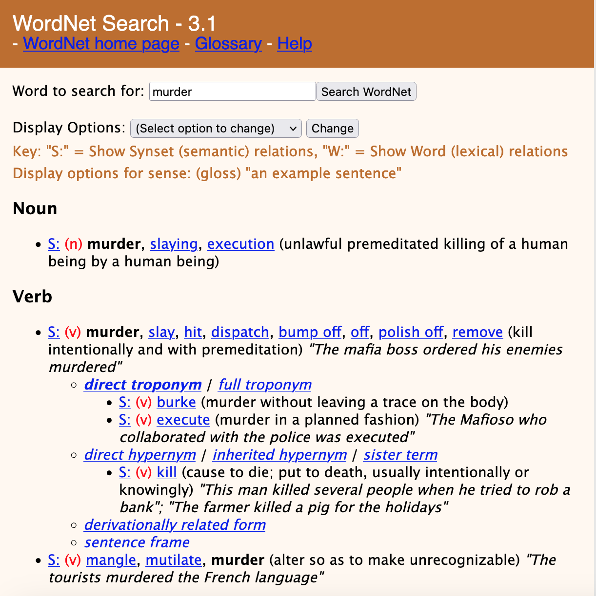 Como exemplo, a Figura 9.2 apresenta os synsets da palavra “murder” (verbo “assassinar”, em português) da PWN. Ao todo são três synsets, um na classe Noun (substantivo) e dois na classe Verb (verbo). O primeiro synset da palavra “murder” (na classe Verb) tem como tropônimos diretos os verbos “burke”, “execute” e hiperônimo direto o synset “kill”.