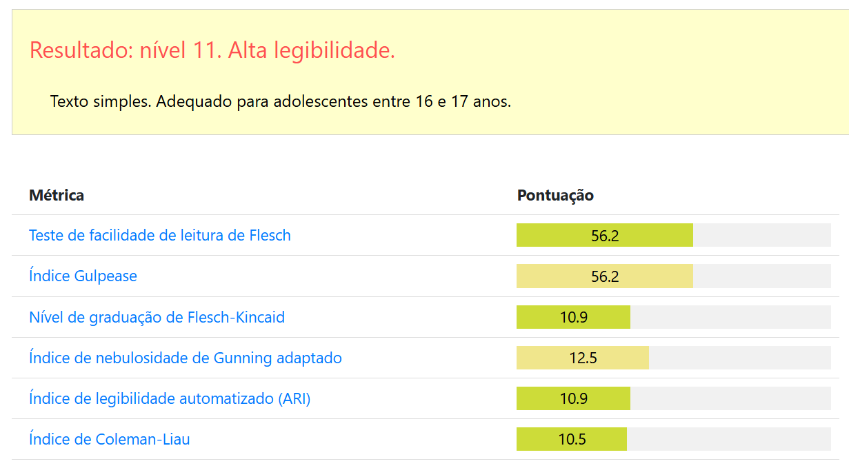 \[ \mathrm{FK} = 0.39 \left ( \frac{\text{total palavras}}{\text{total sentenças}} \right ) + 11.8 \left ( \frac{\text{total sílabas}}{\text{total palavras}} \right ) - 15.59 \tag{5.3}\]