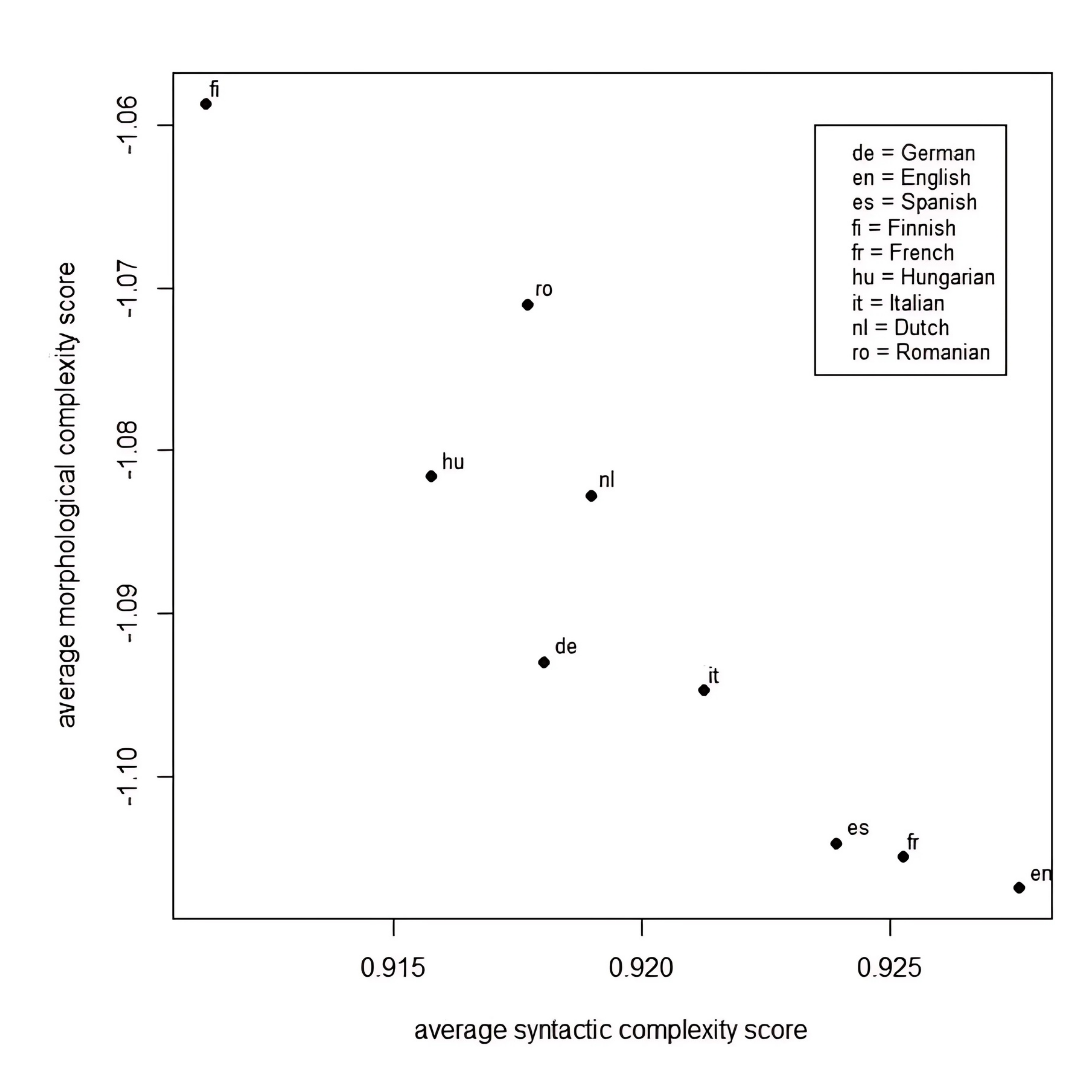Quando aplicadas ao mesmo texto traduzido em diferentes línguas – visando verificar a hipótese do trade-off morfossintático – essas métricas nos apresentam resultados bastante interessantes. As Figuras 5.11 e 5.12 mostram uma renderização do trade-off em dois experimentos distintos. O primeiro, realizado em Juola (2008), mostra uma troca clara entre as complexidades sintática e morfológica, como previsto por Hockett, para algumas línguas europeias.