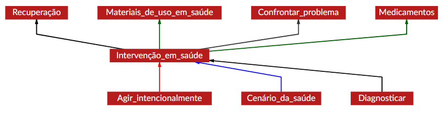 Por sua vez, a relação de Uso (Using), indicada pelas setas verdes, ocorre quando a compreensão de um frame depende de outro que funciona como seu contexto de fundo. É o caso de Medicamentos e Materiais_de_uso_em_saúde, por exemplo, que pressupõem a cena da Intervenção_em_saúde para serem plenamente compreendidos, visto que tanto os medicamentos quanto os materiais são utilizados no contexto de uma ação médica. Assim, Intervenção_em_saúde fornece o cenário necessário para interpretar o uso desses elementos, dando sentido às práticas que envolvem seu manuseio ou aplicação.