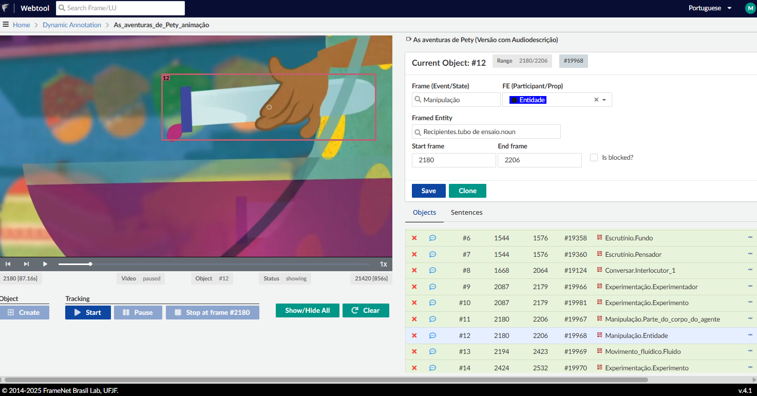 A Figura 16.15, referente ao recorte do vídeo correspondente à sentença da AD apresentada na Figura anterior, ilustra um exemplo de anotação de conteúdo de vídeo. Nela, o anotador criou uma bounding box para delimitar o artefato em cena. Esse artefato foi anotado como EF Entidade no frame Manipulação, que descreve eventos em que um agente manipula uma entidade com um propósito específico. Além da anotação do frame semântico que designa o evento ou estado, o objeto visual também é rotulado quanto ao seu próprio frame. Assim, a entidade delimitada é um tubo de ensaio, que está associado ao frame Recipiente na base da FN.Br. Esse duplo nível de anotação, que especifica tanto o evento quanto a entidade, promove refinamento semântico para o dataset. Essa infraestrutura de anotação possibilita o registro das evocações semânticas nos diversos modos presentes no dataset, oferecendo base para análises intermodais, comparação entre recursos de acessibilidade e avaliação de preservação de sentido entre os modos, como será explorado na próxima seção.