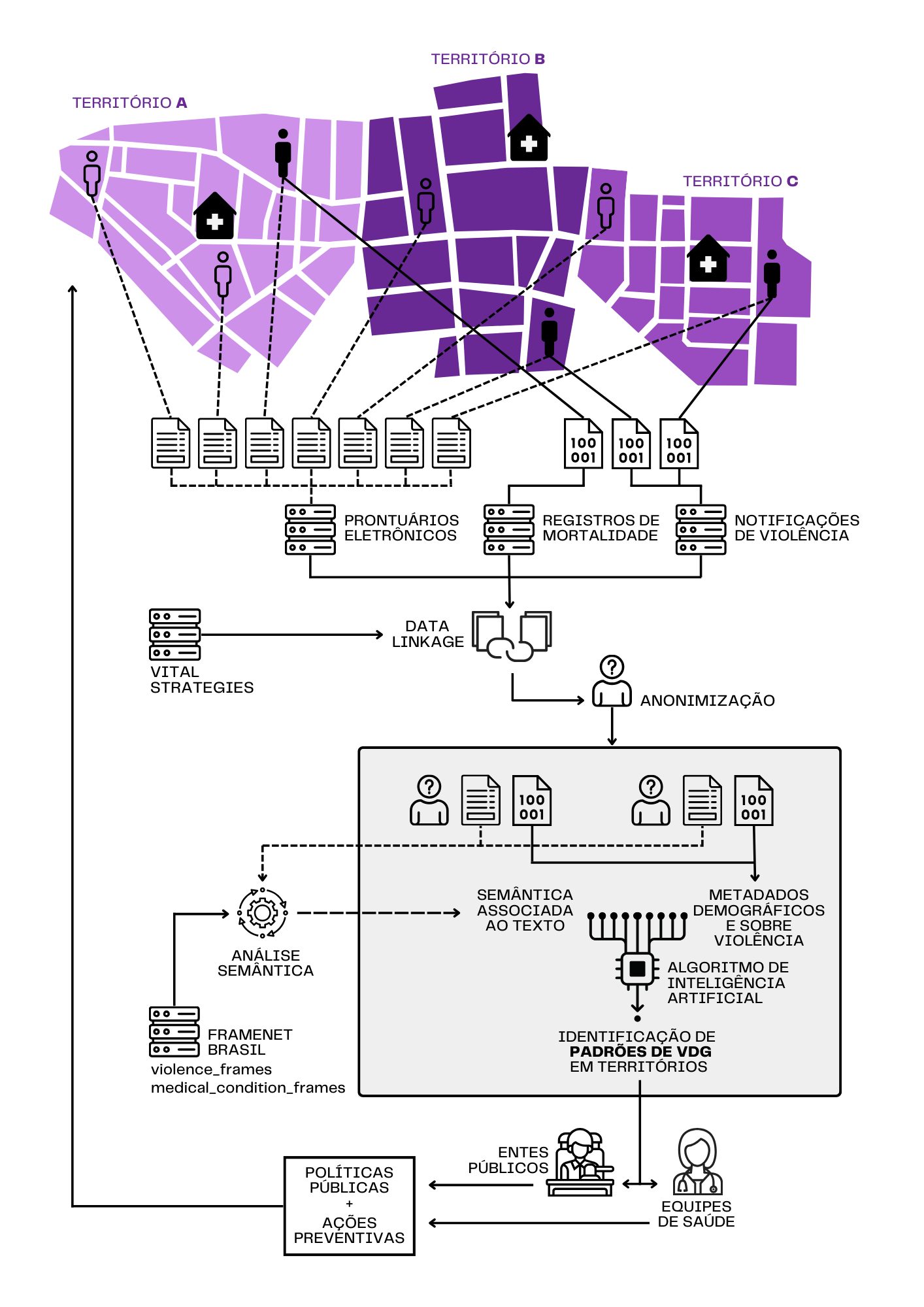 Considerando este cenário, Vital Strategies Brasil e FrameNet Brasil propuseram o projeto DataToStopGBV, que visa ao desenvolvimento de recursos que possam levar ao alerta precoce de possíveis casos de violência contra mulheres que não foram expressamente reportados aos órgãos competentes. A proposta parte da análise semântica de dados inseridos nos campos abertos de prontuários eletrônicos do SUS, com o objetivo de identificar padrões semânticos, a partir da metodologia da FrameNet, para compreender como tais padrões de violência aparecem nos registros de saúde. Essa proposta vai na contramão da maioria das pesquisas neste campo, que focam em dados parametrizados (Malta et al., 2023; Mascarenhas et al., 2020; Pinto et al., 2021).