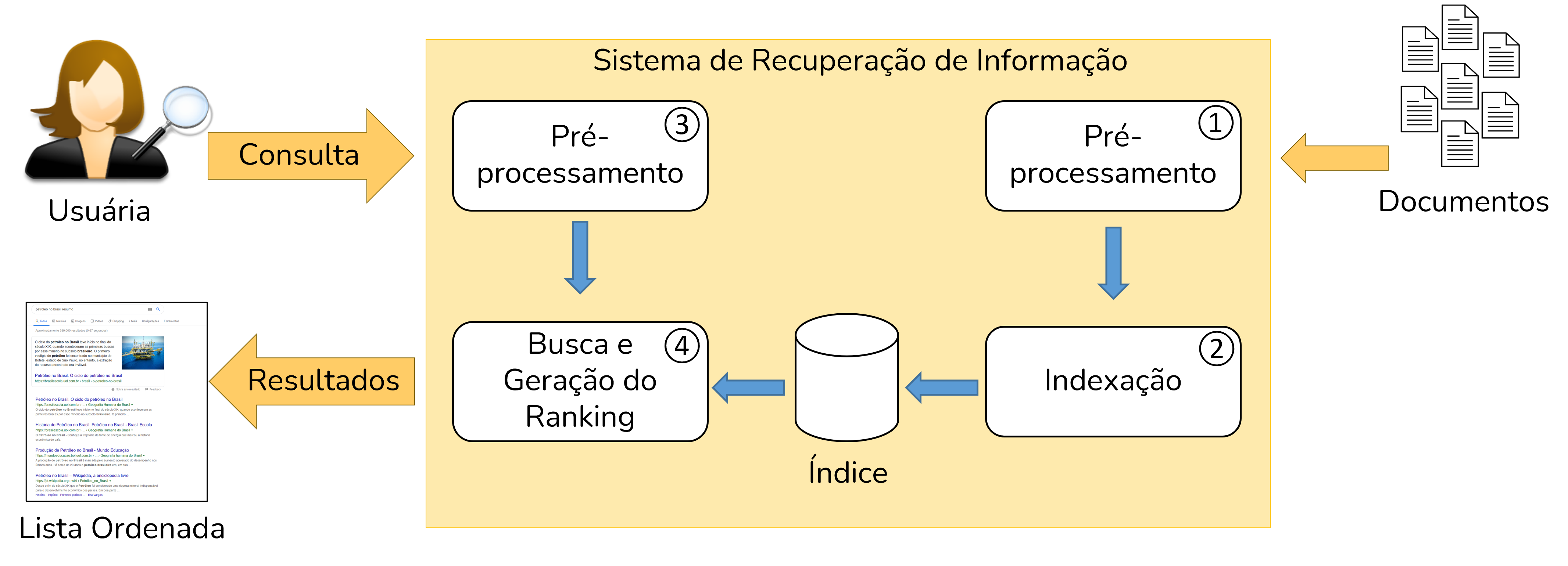 A Figura 1.1 mostra uma visão geral do processo de RI. Em uma ponta, há a usuária que tem uma necessidade de informação e, na outra ponta, temos uma coleção de documentos textuais. A consulta da usuária é submetida a um sistema de RI (representado pelo retângulo laranja). As Etapas 1 e 2 ocorrem offline, pois o índice precisa estrar pronto antes que o sistema possa receber consultas. Na Etapa 1, os documentos da coleção são pré-processados para então, na Etapa 2, serem indexados. Na Etapa 3, o sistema executa sobre a consulta as mesmas operações de pré-processamento que foram aplicadas na Etapa 1. O texto pré-processado da consulta é utilizado, na Etapa 4, para buscar no índice os documentos que mais bem atendam a consulta. Os resultados da consulta são então retornados à usuária sob a forma de uma lista ordenada.