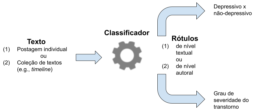 Com base em um corpus textual rotulado com informações de saúde mental, há diversas formulações possíveis para o problema computacional a ser resolvido. Dentre estas, as mais comuns são a detecção de transtornos de saúde mental (e.g., decidir se um indivíduo é depressivo ou não, como em (Yates et al., 2017)), e a detecção de sintomas (e.g., decidir se um texto expressa um sintoma tradicional de depressão, como em (Yadav et al., 2020)). Outras formulações menos frequentes para o problema incluem o objetivo de determinar o grau de severidade de um determinado transtorno (Mann et al., 2020), ou diferenciar o discurso de indivíduos depressivos de outros meramente interessados em saúde mental (Santos et al., 2020), ou identificar uma granularidade maior de sintomas e fatores protetivos e de risco para a depressão (Mendes; Caseli, 2024). Há, ainda, outra formulação popularizada pela série de desafios computacionais eRisk (Losada; Crestani, 2016) que é a tarefa de detecção precoce de risco de depressão e outros transtornos, em que o objetivo consiste em prever o estado de saúde mental de um indivíduo com base no menor volume possível de publicações em ordem cronológica, ou seja, o mais cedo possível.